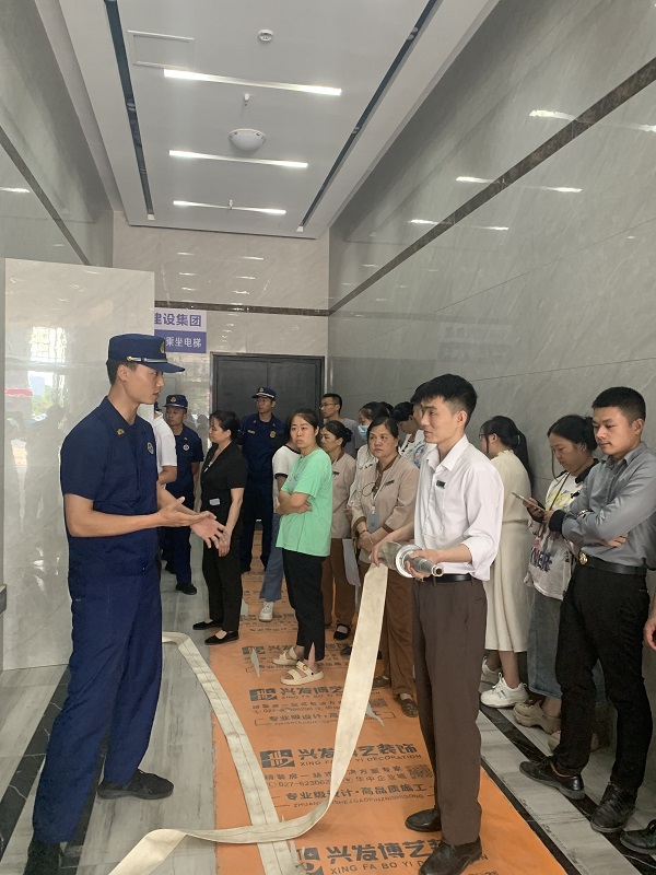 在生動有趣的消防安全培訓(xùn)結(jié)束后,消防支隊專家與集團全體員工到大廈一樓進行實地演練,消防支隊專家們逐一介紹滅火器材和消防水帶的使用方法及相關(guān)注意事項。集團員工在認真聽完介紹后主動實踐,將理論知識內(nèi)化于心,實踐于行。