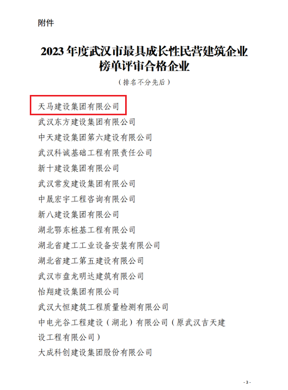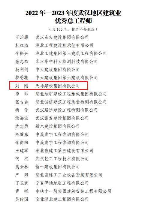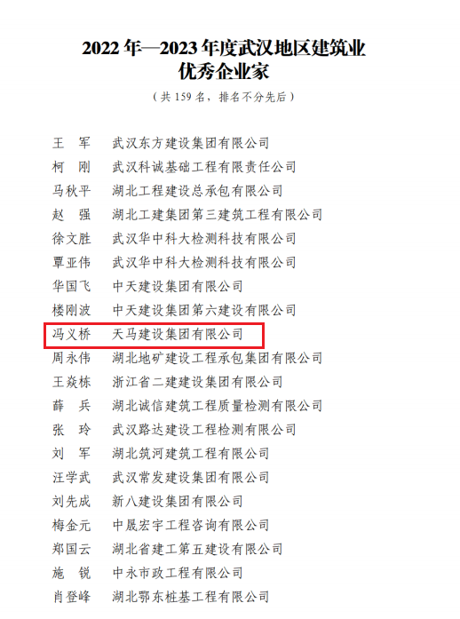 近日,天馬建設(shè)集團榮獲2023年度武漢市最具成長性企業(yè)和2022-2023年度武漢地區(qū)建筑業(yè)優(yōu)秀企業(yè),集團黨委書記、董事長馮義橋獲“優(yōu)秀企業(yè)家”,集團總工程師劉剛獲“優(yōu)秀總工程師”,余勝武獲“優(yōu)秀項目經(jīng)理”。